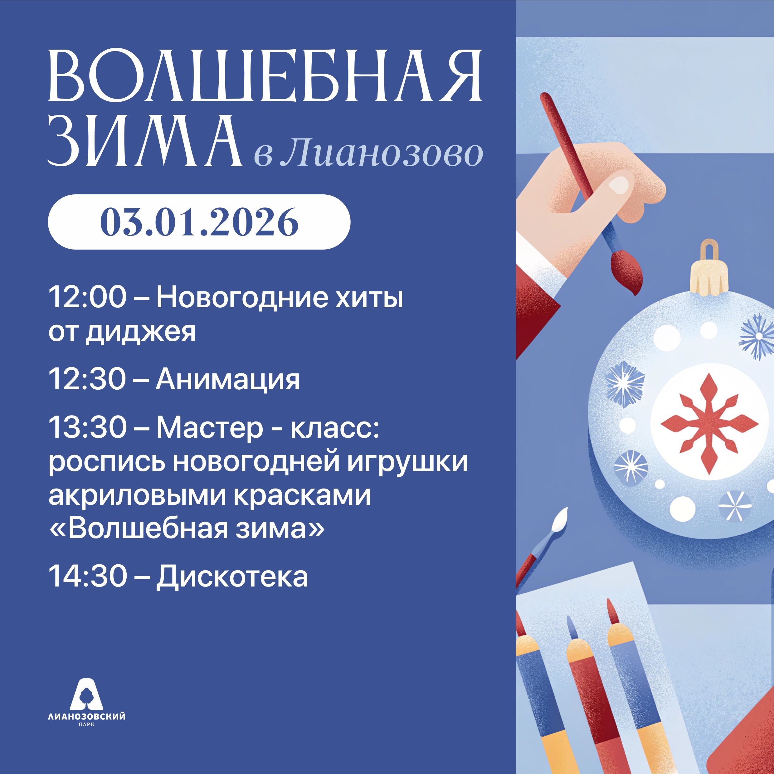 Приглашаем ребят от 3 до 14 лет в Лианозовский парк на бесплатные мастер-классы 27 и 28 декабря.